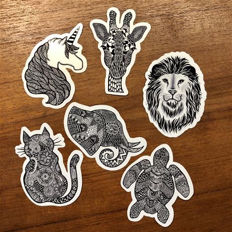 Set Of 6 Die Cut Zentangle Animal Stickers 2.7"